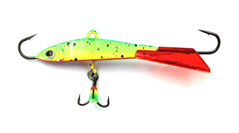 Имеет острую мордочку и выразительные глаза с жестким пластиковым хвостиком красного цвета, благодаря которому приманка имеет интересную игру с разворотами по вертикали. Это применяется для привлечения хищника к лунке с больших расстояний. Эти приманка двигаются плавно и далеко, и медленно возвращаются к лунке.