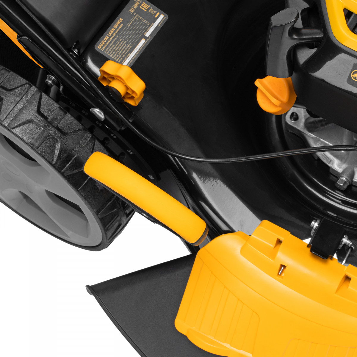 • Комфортная работа — угол наклона рукоятки регулируется в соответствии с ростом пользователя, на панели управления предусмотрен подстаканник, поэтому можно не расставаться с любимым напитком во время кошения.