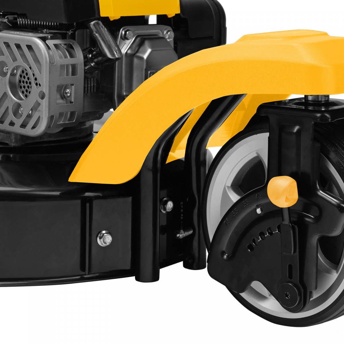 быстрая очистка_мульчирование_боковой выброс_блокировка переднего колеса с панели управления_индикатор заполнения травосборника_комбинированный травосборник_панель с подстаканником_самоходная_высокая маневренность