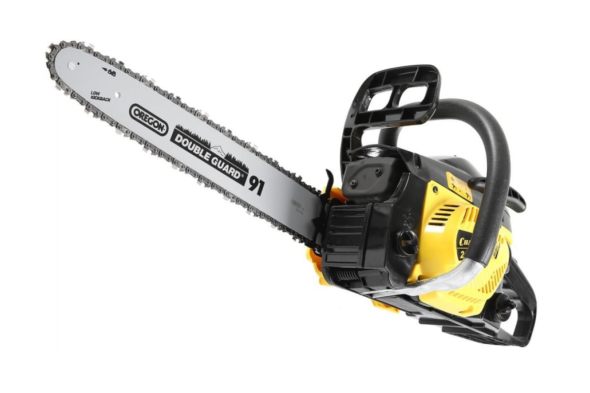 Инструмент оборудован уловителем цепи, рычагом тормоза, цепью с низкой отдачей и блокиратором курка газа, что повышает безопасность использования.