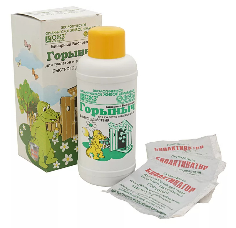 Жидкость + порошок, флакон. Бинарный (двухкомпонентный) биопрепарат быстрого действия для туалетов и выгребных ям. Содержит ассоциацию микроорганизмов и биокатализаторы, способные высвобождать ферменты, расщепляющие отходы. Эффективно разлагает и разжижает органику, фекалии, жиры, бумагу. Устраняет неприятные запахи разложения органических продуктов жизнедеятельности. Снижает затраты по откачке, очистке выгребных ям. Переработанные отходы экологически безопасны. Вносите их в компостную кучу. Безопасен для людей, животных, растений.