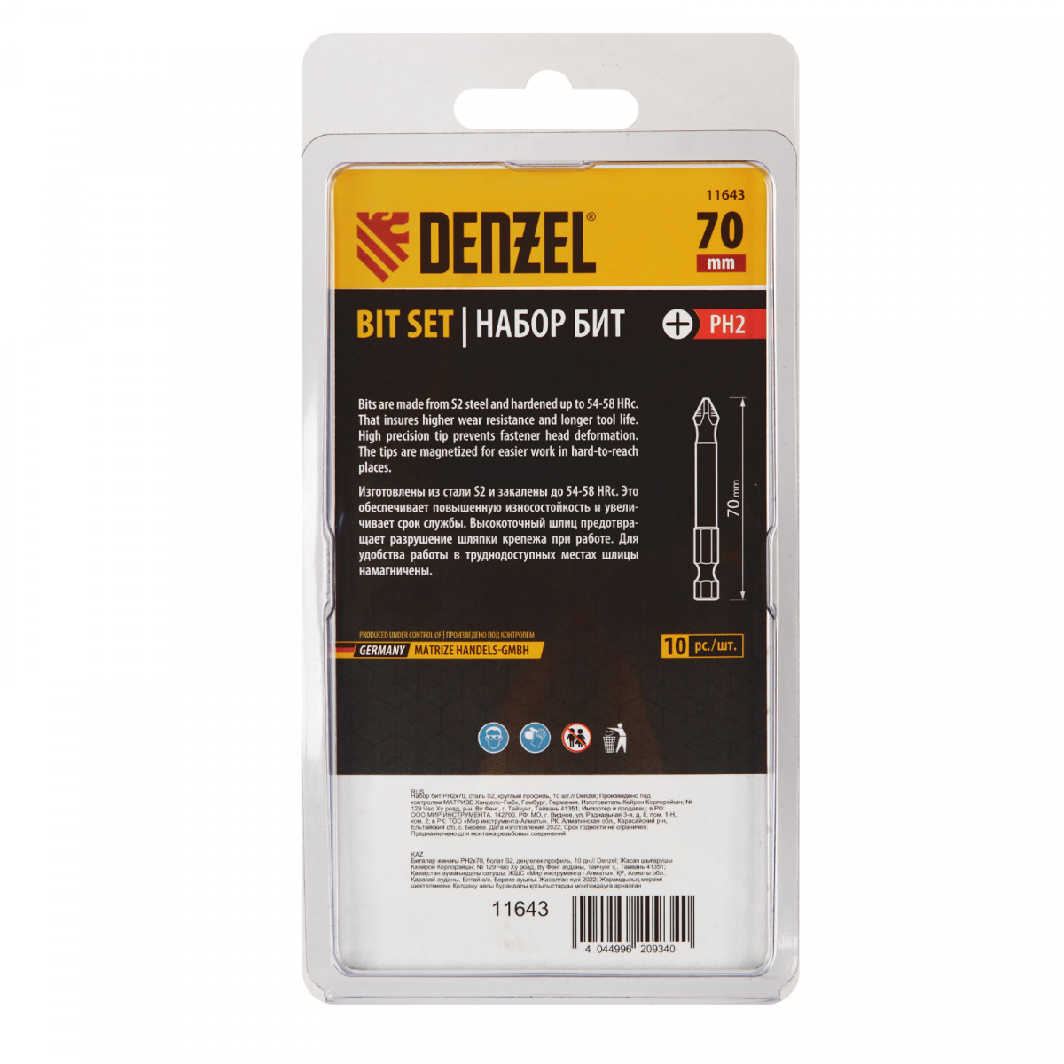 Бита PH2х70, сталь S2, цилиндр., 10 шт. Е 6,3 Denzel