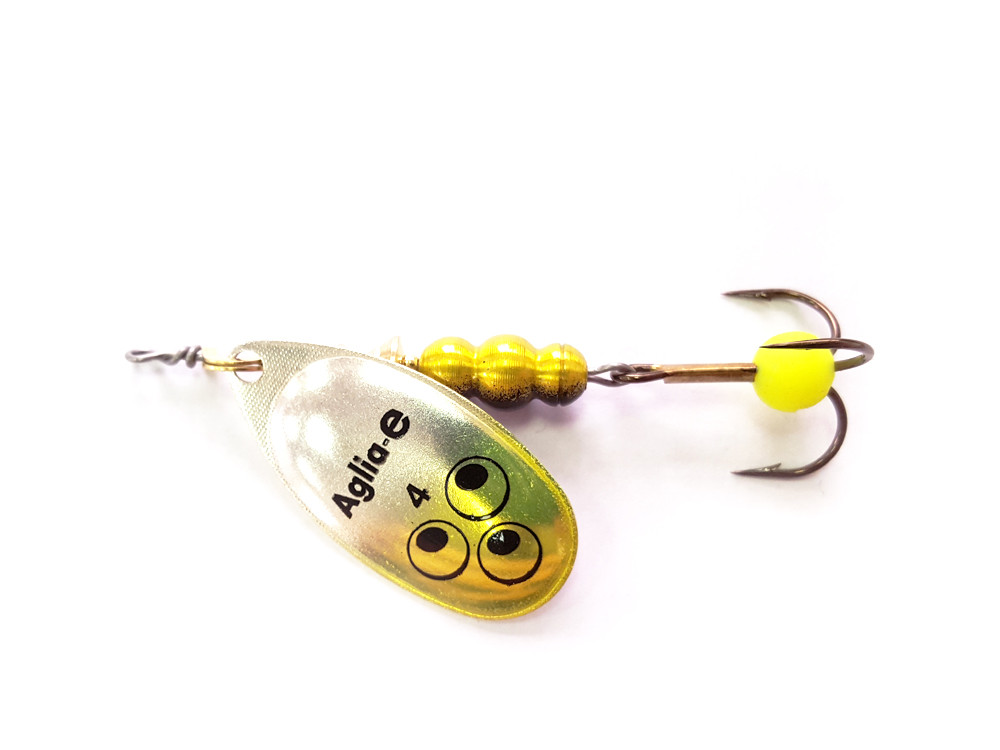 AGLIA TW — отличаются от базовой модели AGLIA двухцветной рефлекторной окраской лепестка и возможностью быстрой замены тройника. Грузик сердечника у AGLIA TW имеет внутреннюю резьбу с очень крупным шагом. Проволочная ось завершается колечком для крючка, сопряженным с пружинной шпилькой. Находясь в теле груза, пружинная шпилька упирается в уступ крупной резьбы. В данном случае шестигранный грузик служит винтовым замочком. Освобождение шпильки осуществляется простым свинчиванием груза, а возвратная фиксация — вдавливанием шпильки в его тело. Это простой, но очень надежный узел крепления (не разрушается даже при значительных нагрузках). AGLIA TW — настоящий клад для любителей экспериментов на водоемах. Рыболов получает возможность быстро укомплектовать вращалку пластиковой рыбкой, виброхвостом, твистером или просто тройником с мухой подходящего цвета.