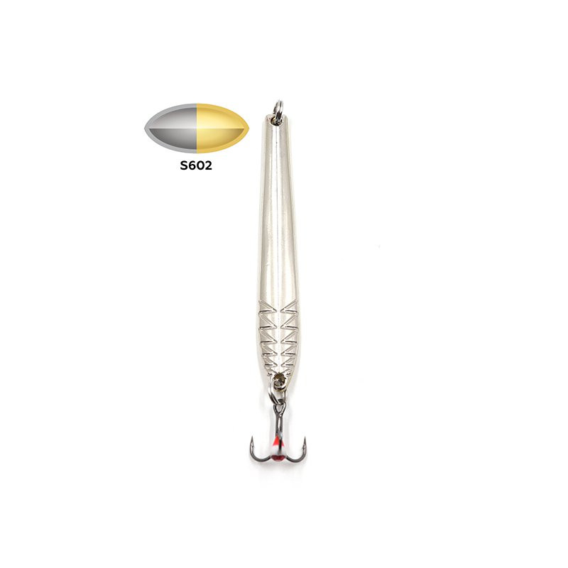 У блесны узкая вытянутая пластина, в лицевой части чуть изогнутая. Такая форма обуславливает соблазнительную выразительную игру: приманка красиво покачивается и отклоняется в сторону от вертикали на подбросах различной интенсивности. Блестящая поверхность пластины при попадании света заманчиво бликует. Спереди в нижней части есть фигурное рифление.