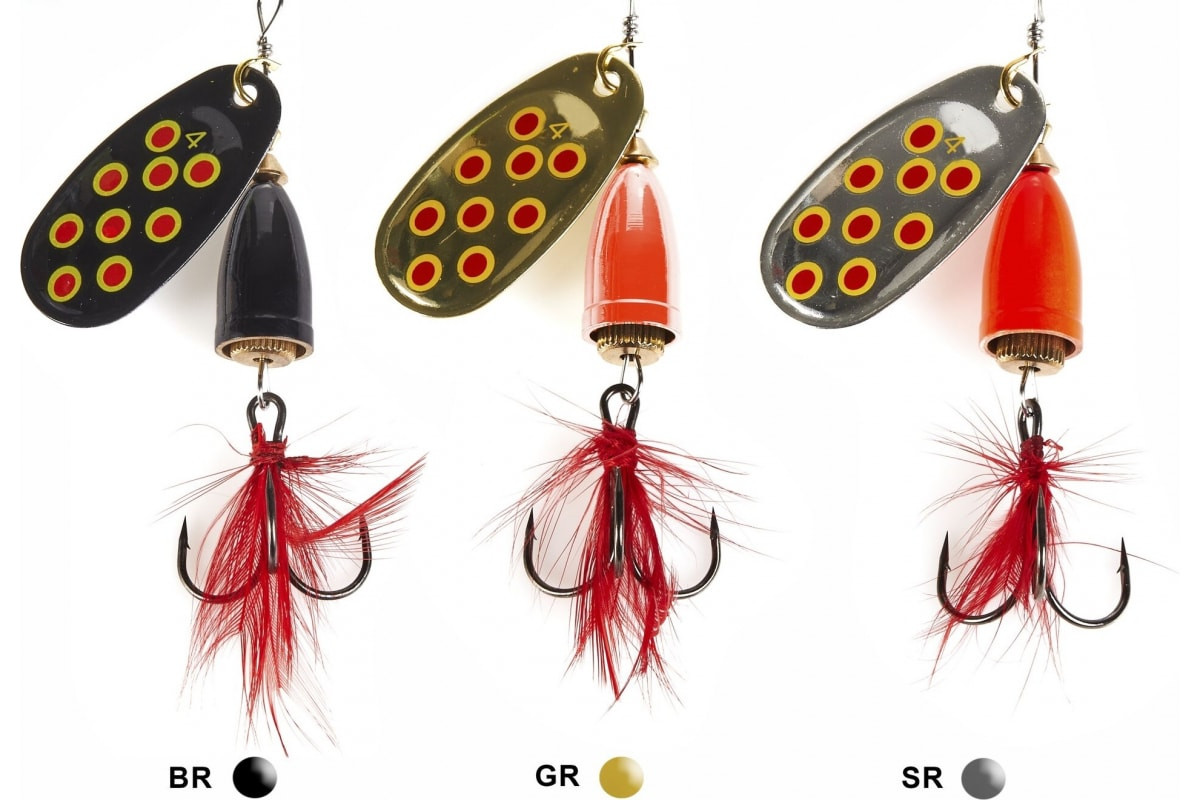 Блесна универсального применения. Лепесток при вращении отклоняется от оси на 45ᵒ. Применяется для ловли в стоячих водоемах и в реках со слабым и средним течением. Пять размеров, от 01 до 05 и весом 4,5; 6; 8; 10; 13 грамм, семь расцветок: BRD, C, CRD, G, GRD, S, SRD