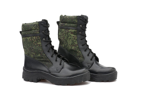 При изготовлении верха ботинок использована качественная и прочная лицевая кожа, и камуфляжная ткань «цифра». Утепление внутренней части ботинок выполнено с использованием современного подкладочного материала Cambrelle, способного впитывать влагу, воздухопроницаемого и приятного на ощупь. Верх ботинок соединяется с подошвой клеепрошивным способом. Стелька – Cambrelle+Eva, которая обеспечивает комфорт, тепло и защиту от бактерий и микроорганизмов. Метод соединения подошвы и верха ботинок – клеепрошивной, наличие формованного задника продлевает срок службы. Мягкий кант ботинок позволяет получить максимальный комфорт при ношении обуви. Использование в конструкции ботинок термопластичного подноска гарантирует защиту ноги от травм. Глухой клапан – элемент защиты от попадания внутрь ботинок мусора и мелких предметов.