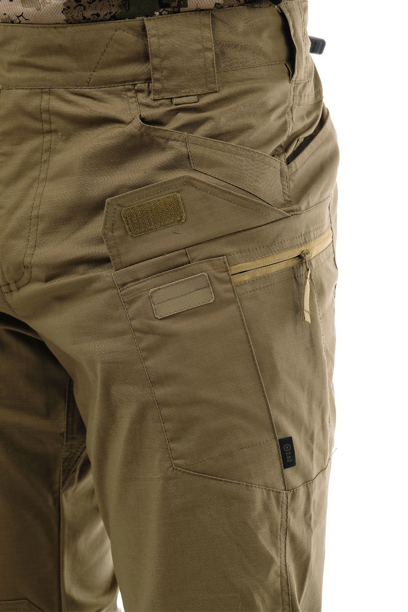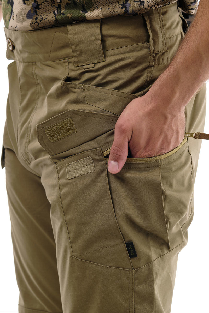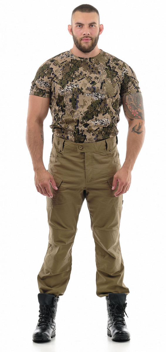 Брюки «Файтер» классического прямого кроя. Застежка на молнию и пуговицу. Пояс по спине собран на резинку, есть шлевки под ремень. Стрелка спереди застрочена. Карманы на бедрах и сзади объемные, застегиваются на листочку с липучкой.