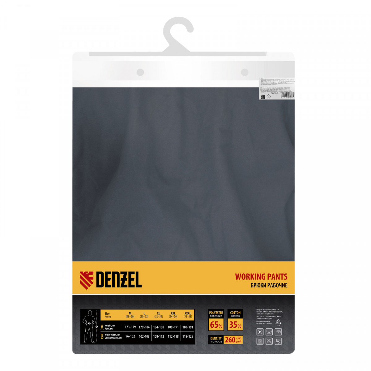 Рабочие брюки Denzel 90385 размера XXL рассчитаны на рост 184-190 см и используются для выполнения профессиональных строительных, ремонтных, сантехнических и производственных работ в теплое время года или в отапливаемом помещении. Защищают пользователя от общих производственных загрязнений, нетоксичной пыли, ветра и незначительных механических воздействий. Изготовлены из ткани плотностью 260 г/м2 (65% полиэстер, 35% хлопок). За счет наличия хлопковых волокон в составе ткань хорошо пропускает воздух и приятна на теле, полиэстер обеспечивает устойчивость к истиранию. Брюки выполнены в практичном темно-сером цвете.