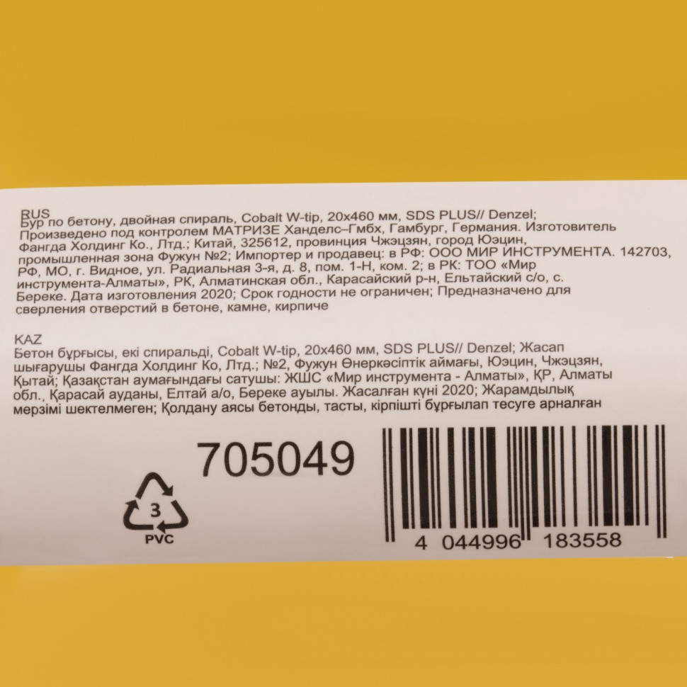 Бур по бетону Denzel Cobalt W-tip 705049 размером 20 х 460 мм, с хвостовиком SDS-plus и двойной спиралью, предназначен для сверления бетона, кирпича и камня. Используется в качестве оснастки для перфораторов с патроном SDS-plus. Бур оптимален для проведения строительных, ремонтных, монтажных работ.