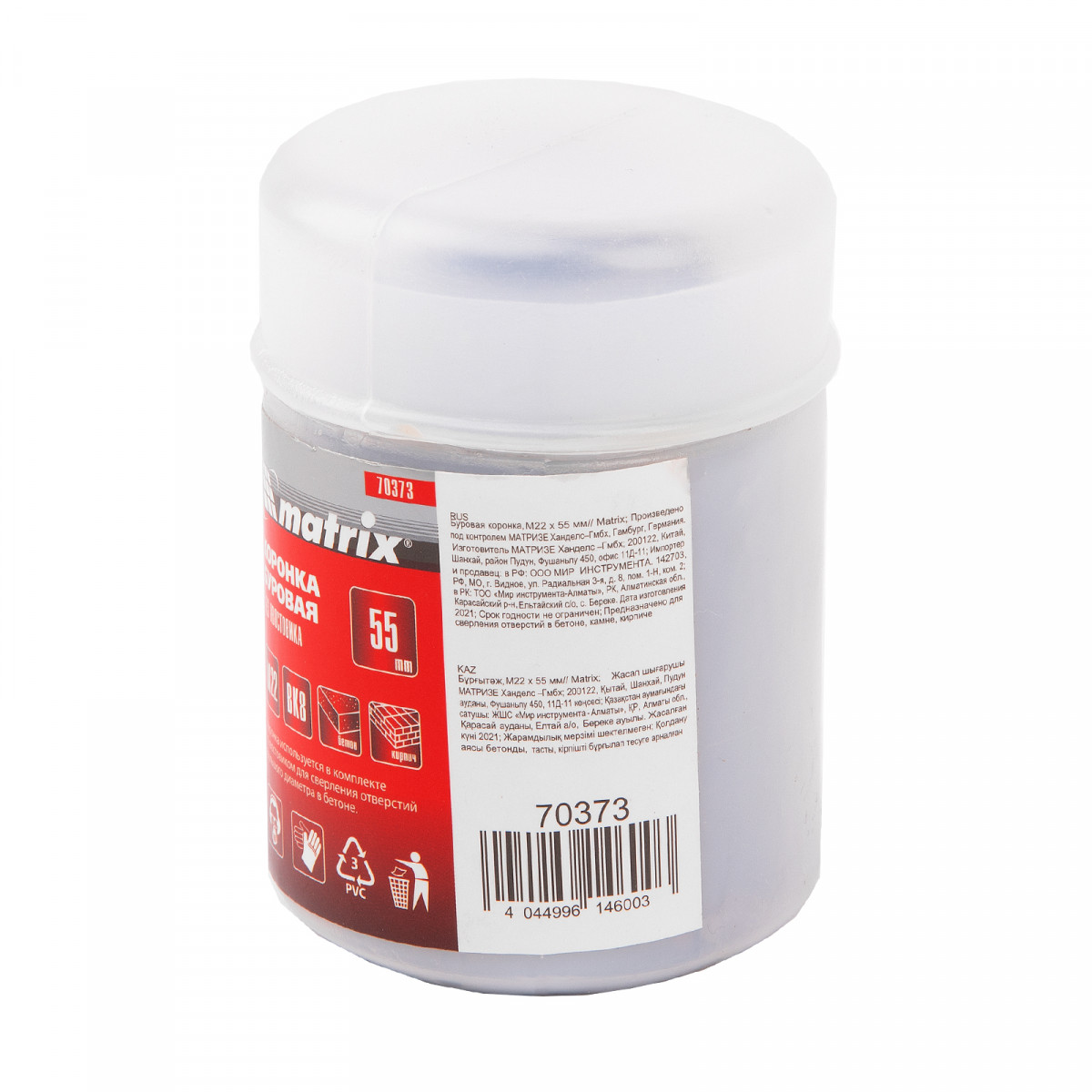 Буровая коронка M22 х 55 мм Matrix 70373 рассчитана на сверление отверстий в бетоне, кирпиче, граните, природном и искусственном камне. Устанавливается на ударные дрели или перфораторы с патронами под хвостовик SDS-Plus или SDS-Max. Коронка позволяет получить большие отверстия, поэтому пригодится для монтажа розеток, выключателей и прокладки труб.