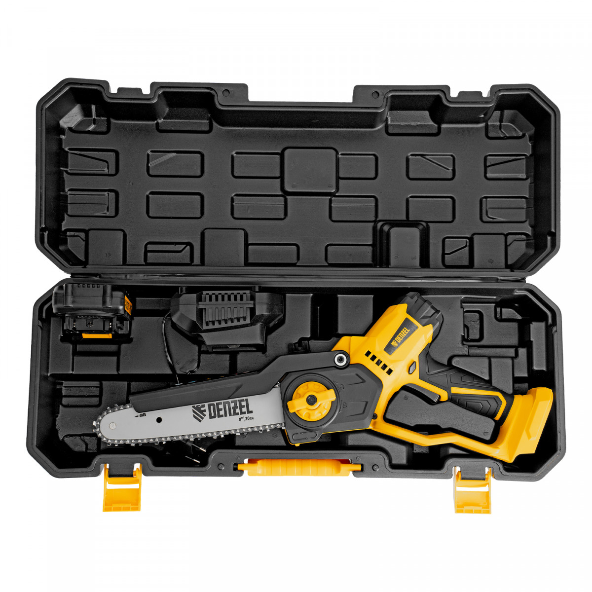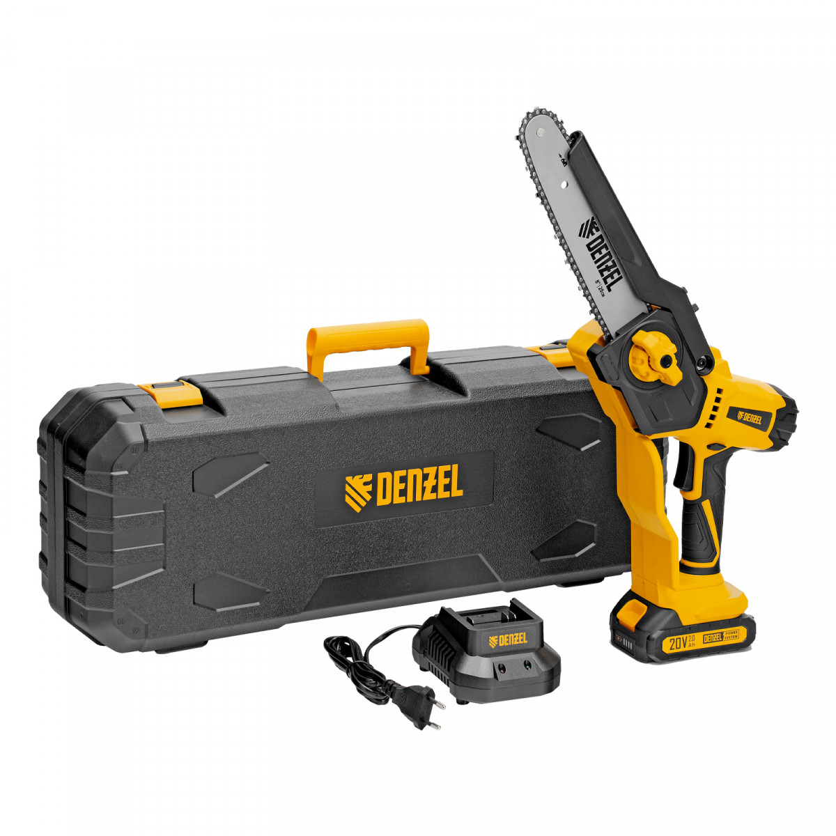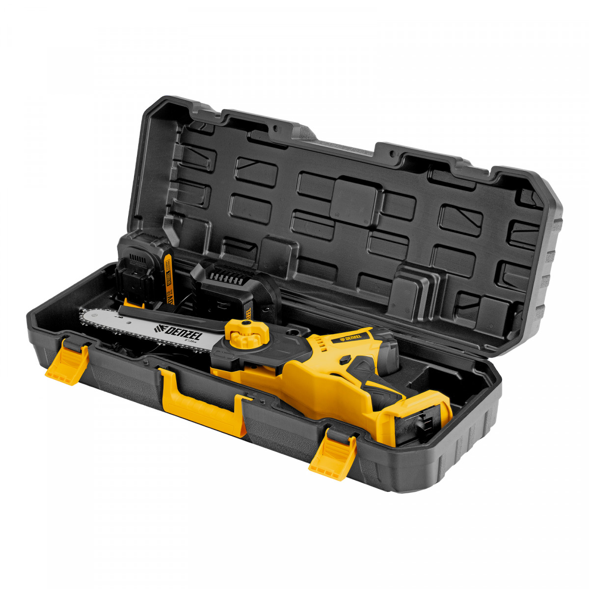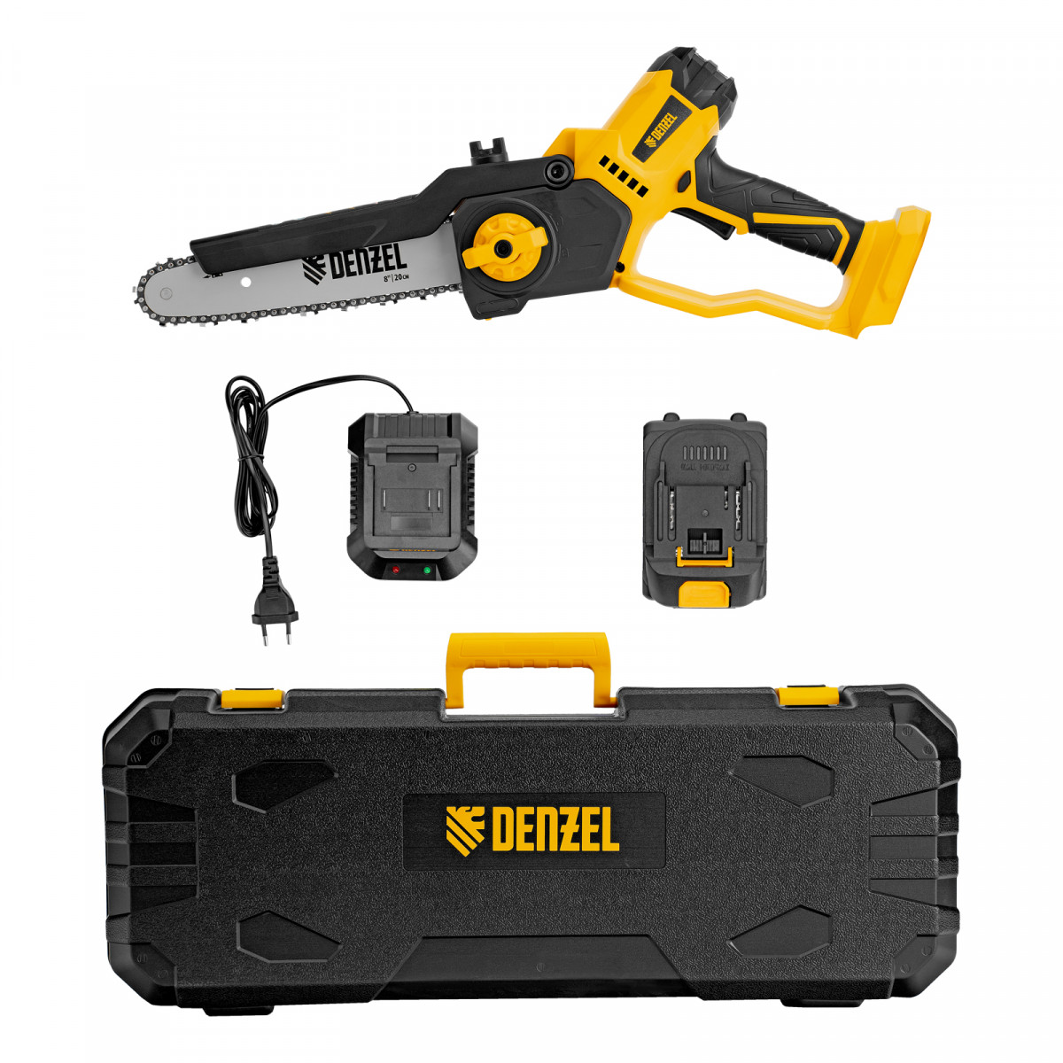 Мини-пила цепная аккумуляторная - 1 штЗарядное устройство - 1 штАккумуляторная батарея Denzel Power System - 1 штРуководство по эксплуатации с гарантийным талоном - 1 шт