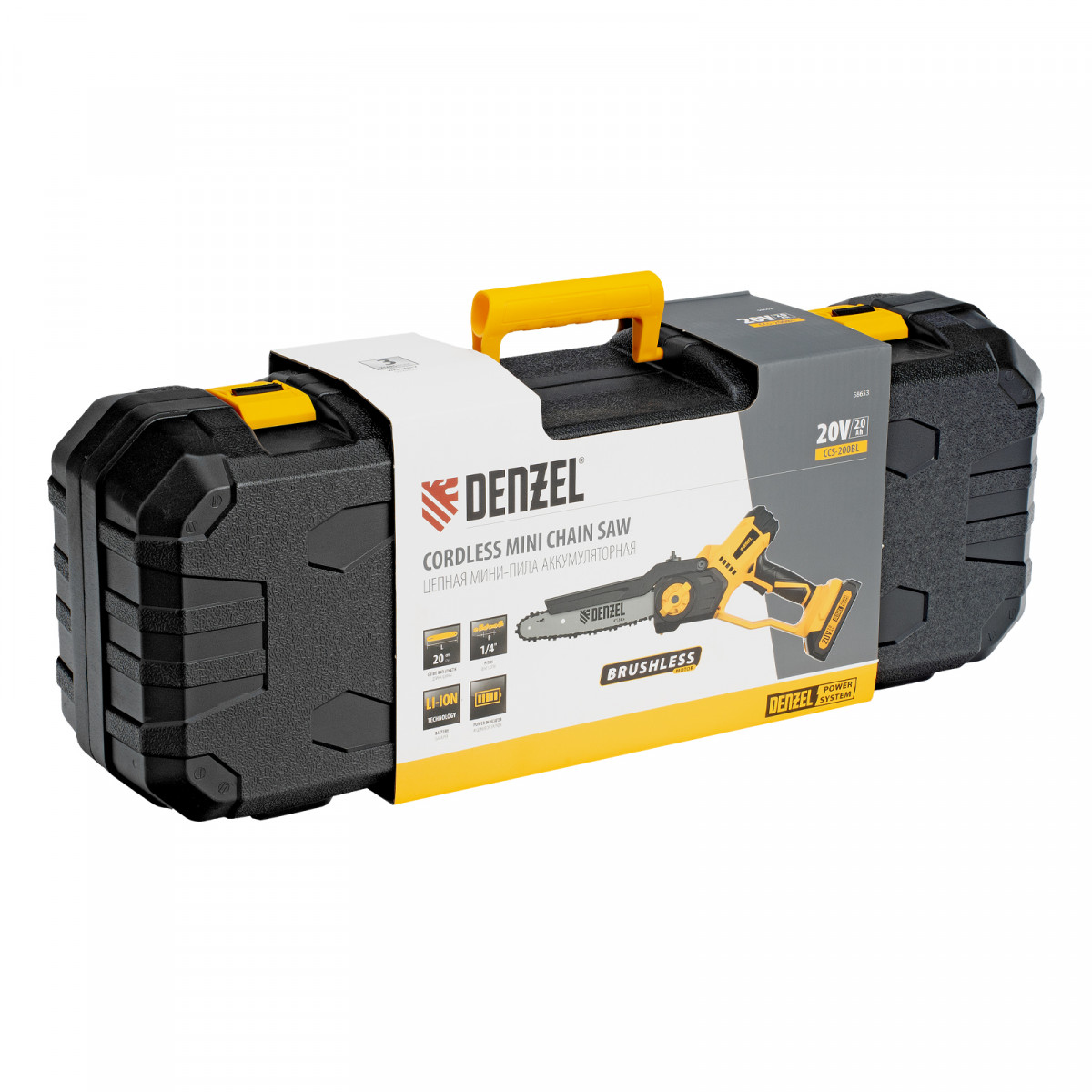 Цепная мини-пила аккумуляторная бесщет., СCS-200BL, шина 200 мм, Li-Ion, 20 В Denzel