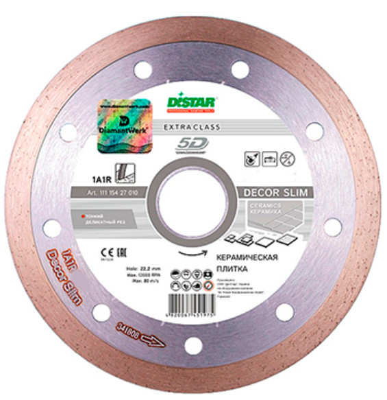 Режущий алмазный диск Distar 1A1R Decor Slim диаметром 125 мм. Предназначен для резки керамических и керамогранитных изделий. Фиксируется к ручному инструменту при помощи посадочного отверстия размером 22,2 мм. Обеспечивает ровный рез без сколов и повреждений. Оснащен тонкой алмазной кромкой высотой 8 мм. Характеризуется повышенной износостойкостью и производительностью.