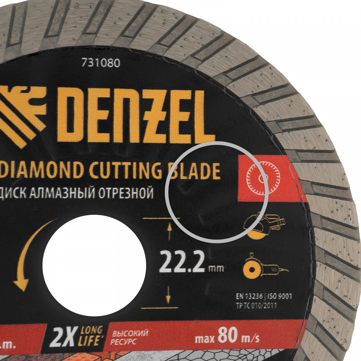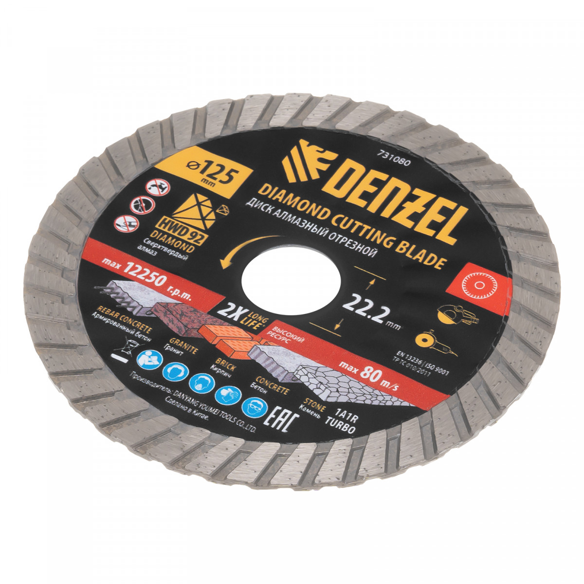 Алмазный отрезной диск Турбо Denzel 731080 диаметром 125 мм, с посадочным размером 22,2 мм и слоем сверхтвердых алмазов HWD92, устанавливается на углошлифовальную машину (УШМ) или штроборез. Используется для сухого резания камня, бетона (в том числе армированного), гранита, кирпича. Рекомендуемая частота вращения — 12250 об/мин.
