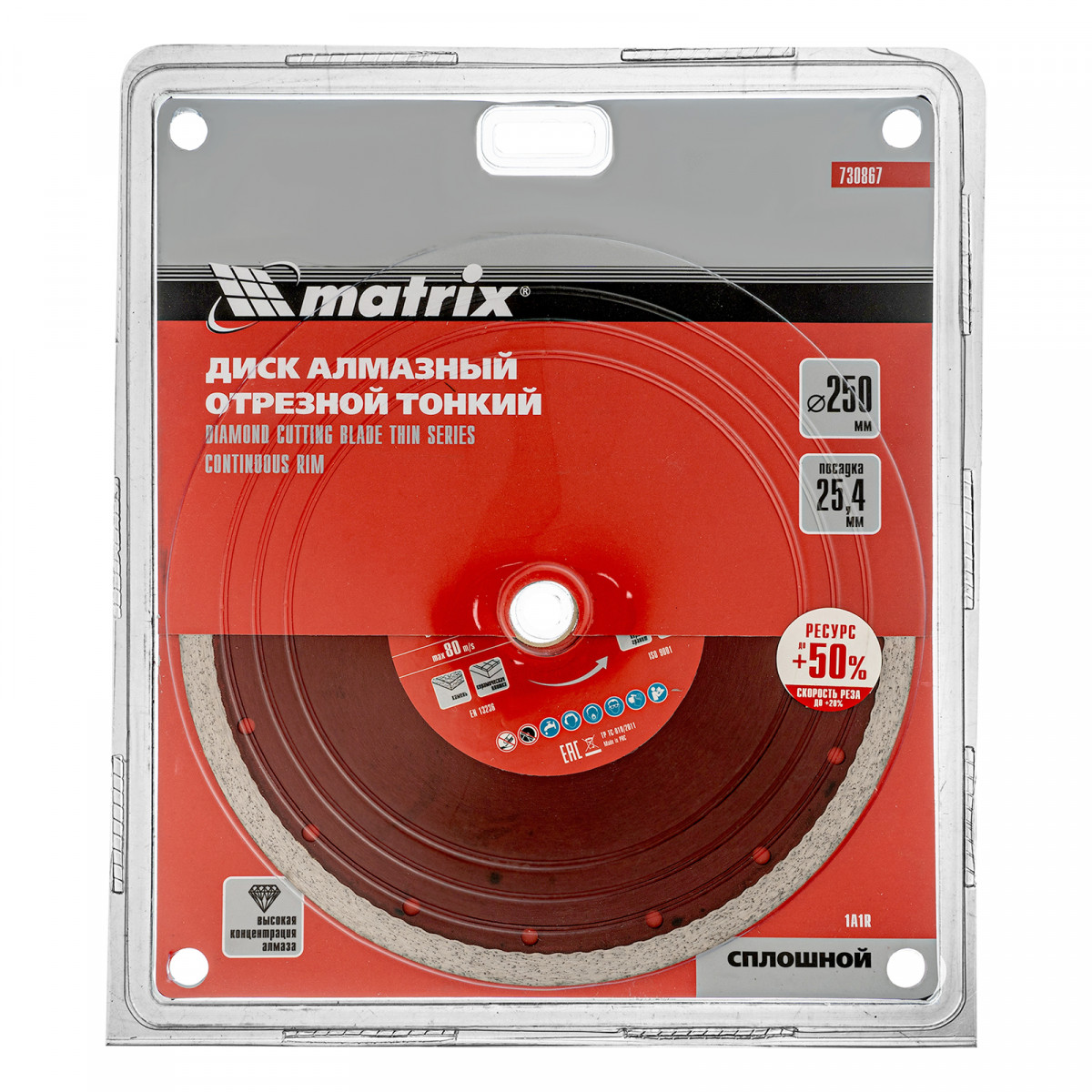 Тонкий сплошной алмазный диск Matrix 730867 диаметром 250 х 25,4 мм предназначен для «мокрого» резания плотных материалов: керамогранита, керамической и кафельной плитки, мрамора, натурального и искусственного камня. Устанавливается на УШМ или плиткорез. Благодаря небольшой толщине 2,3 мм диск снижает нагрузку на инструмент и увеличивает производительность на 20%. Подходит для бытового и профессионального использования. Во время работы рекомендуется использовать водяное охлаждение.