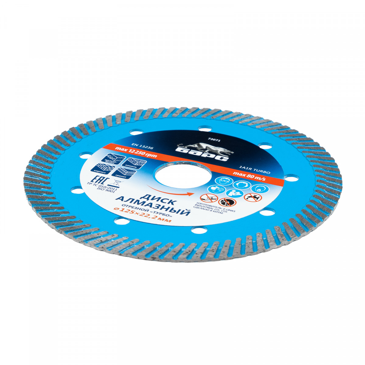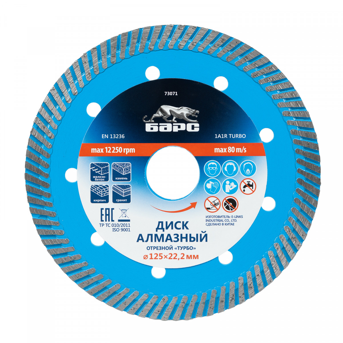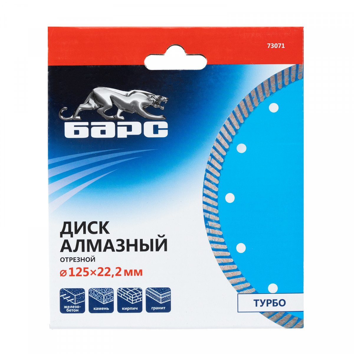 Алмазный диск Барс Турбо 73071 диаметром 125 х 22,2 мм предназначен для сухого резания бетона, в т.ч. свежего, среднеармированного железобетона, камня, кирпича, гранита и песчаника. Совместим с УШМ с посадочным диаметром 22,2 мм, используется для проведения строительных и ремонтных работ.
