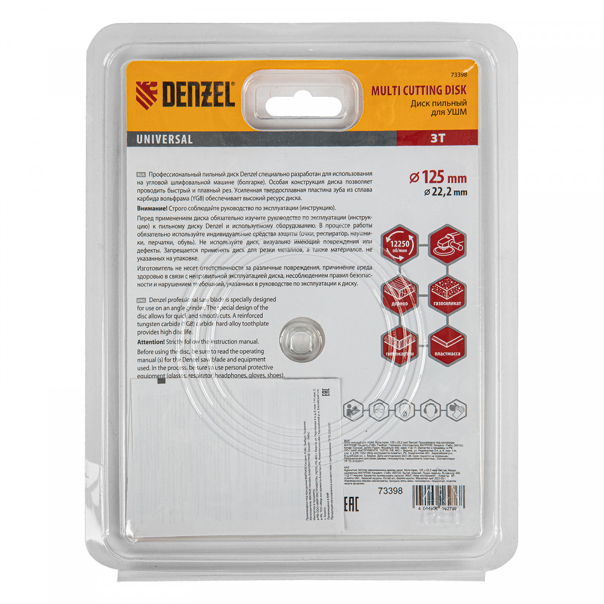 Пильный диск для УШМ Denzel Мультирез 73398 диаметром 125 х 22,2 мм, — оснастка для углошлифовальных машин, позволяющая быстро распилить древесину, тонкий пластик, гипсокартон и газосиликат. Будет полезен как профессиональному мастеру, так и домашнему умельцу. Перед эксплуатацией необходимо изучить инструкцию как диска, так и углошлифовальной машины.
