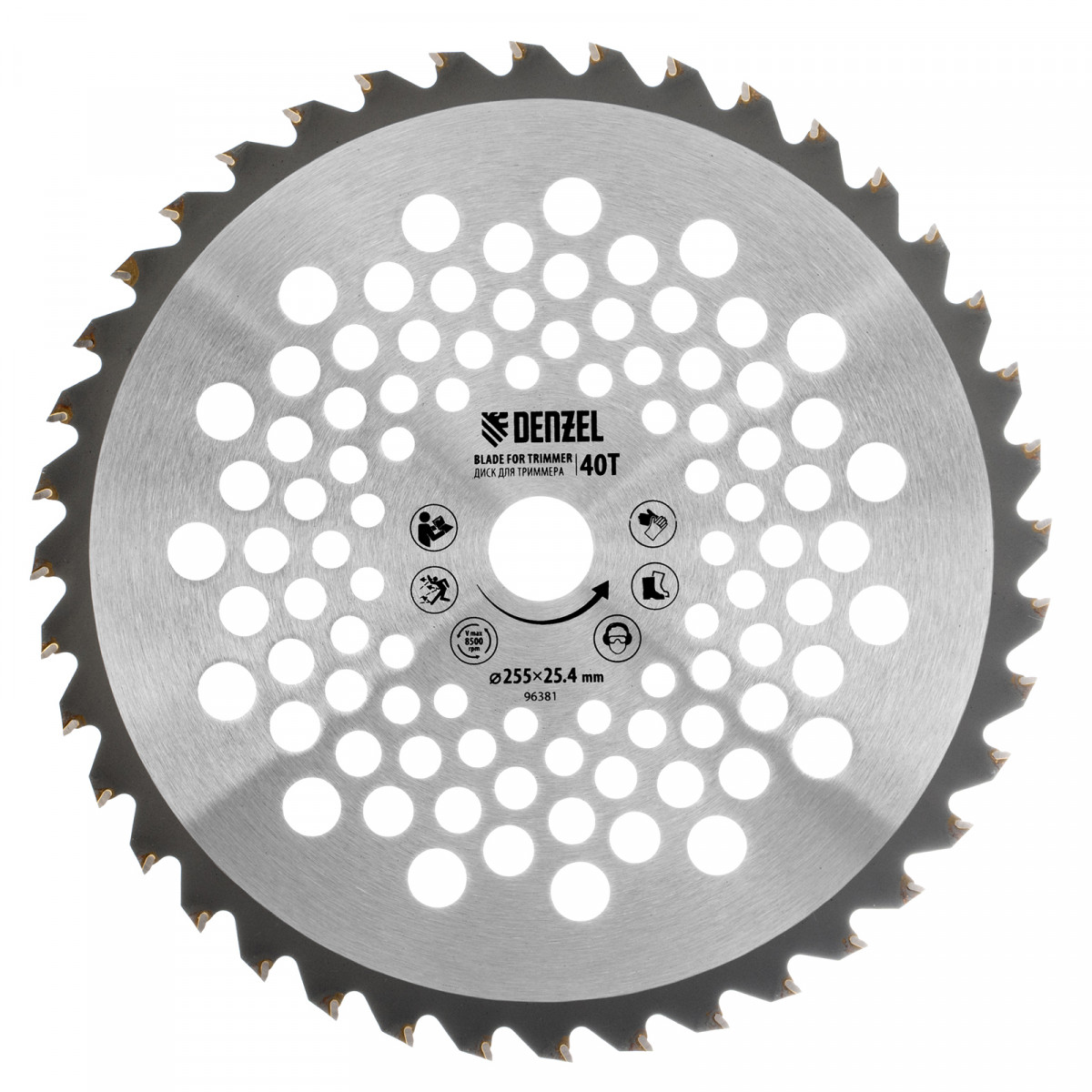 Диск для триммера Denzel 96381 размером 255 х 25,4 мм, с 40 зубьями, предназначен для скашивания травы и мелкого кустарника.
