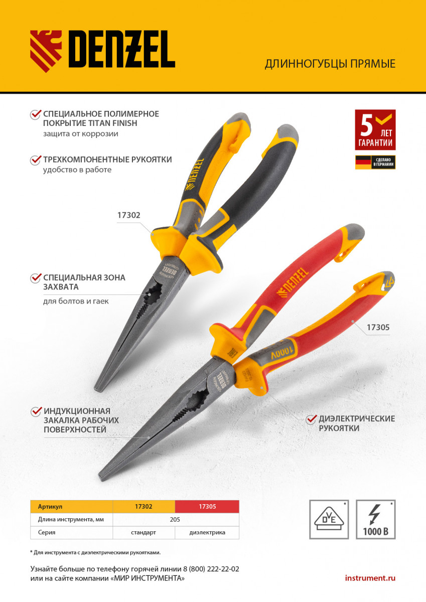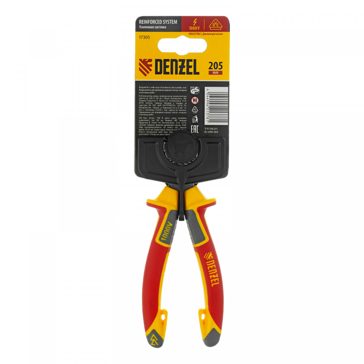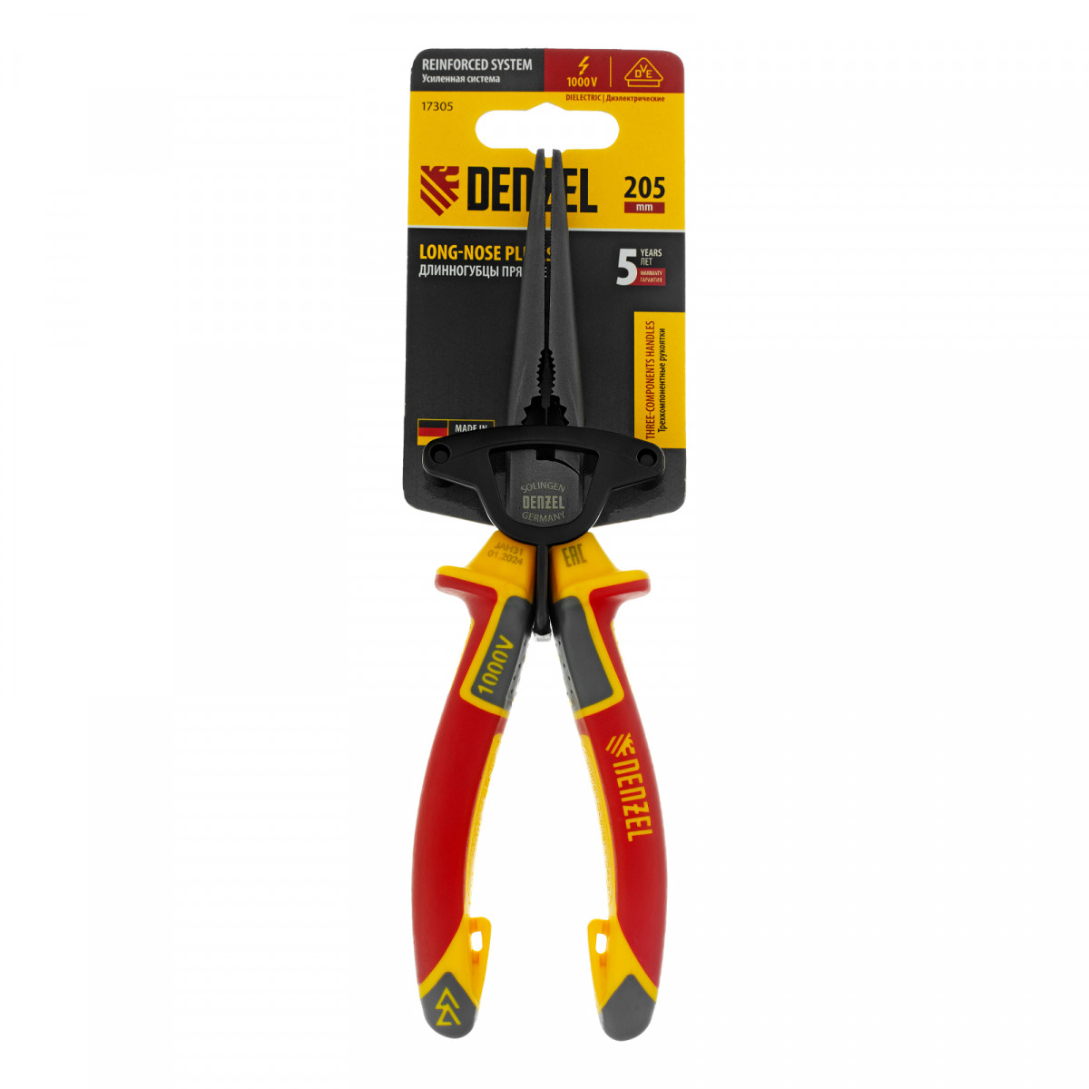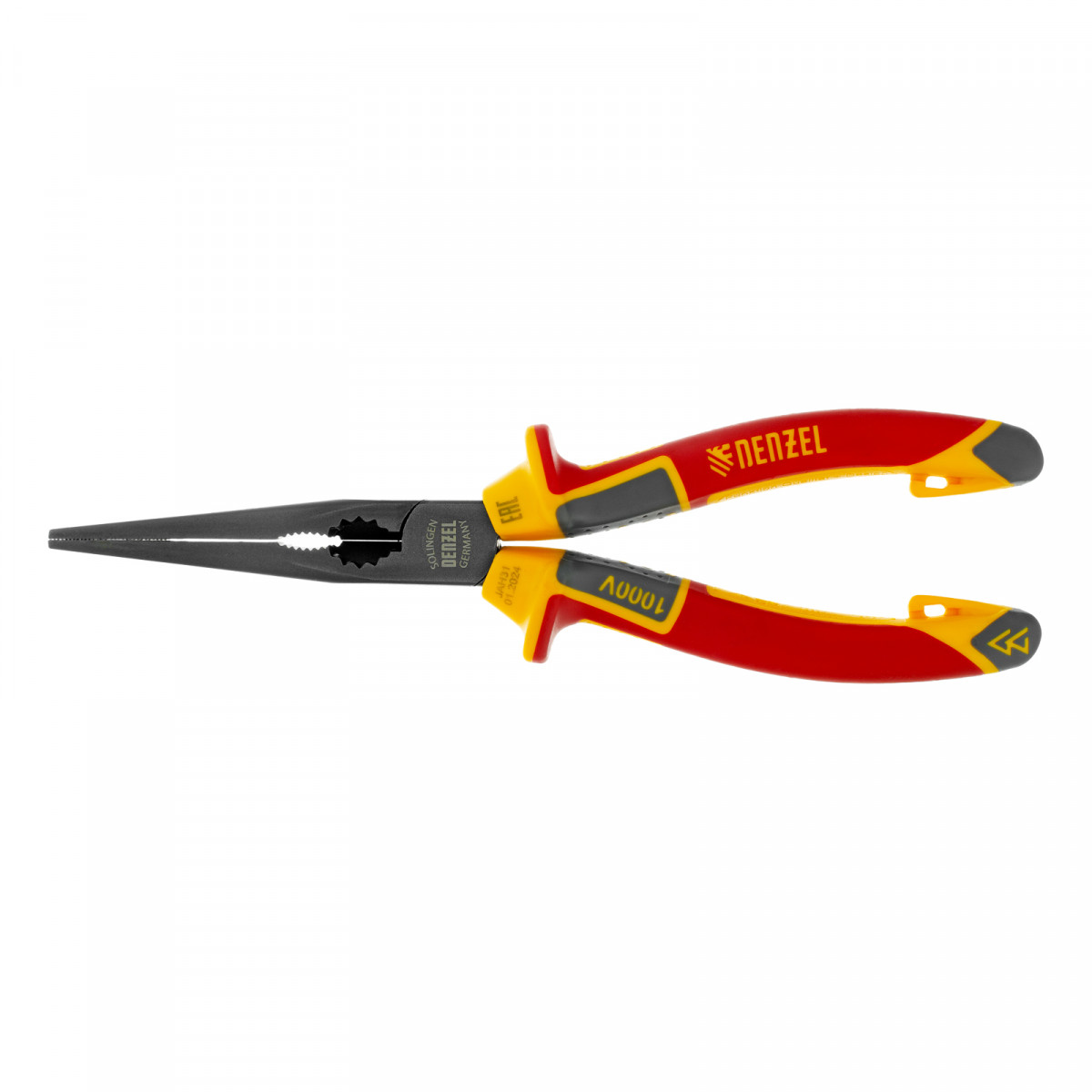 Длинногубцы прямые, диэлектрические рукоятки до 1000 В, трехкомпонентные рукоятки, 205мм Denzel