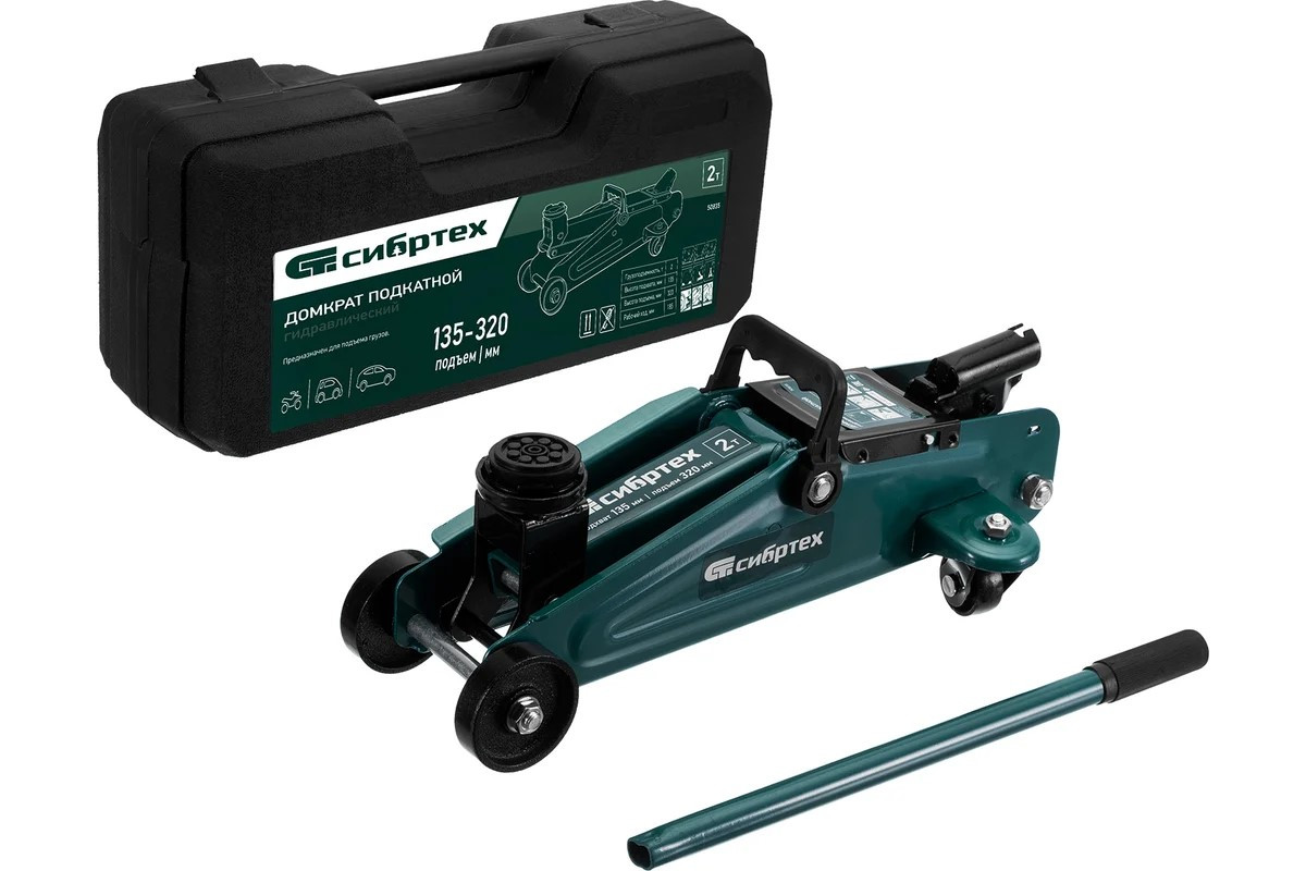 Гидравлический подкатной домкрат , поставляющийся в пластиковом кейсе, с высотой подхвата 135 мм, предназначен для подъема грузов массой до 2 т на высоту до 330 мм. Применяется для обслуживания автомобилей со стандартным клиренсом. Компактный домкрат подходит для самостоятельного использования автовладельцами. ПреимуществаБезопасность — клапан сброса избыточного давления защищает домкрат от перегрузки, предотвращая подъем груза массой более 2 тМаневренность — благодаря поворотным колесам домкрат можно быстро подвести под грузНебольшие габариты — подъемное устройство можно разместить в багажнике автомобиляКомфортное перемещение — производитель предусмотрел удобную рукоятку с подпальцевыми выемкамиУдобное хранение и транспортировка — в комплект поставки включен прочный пластиковый кейс
