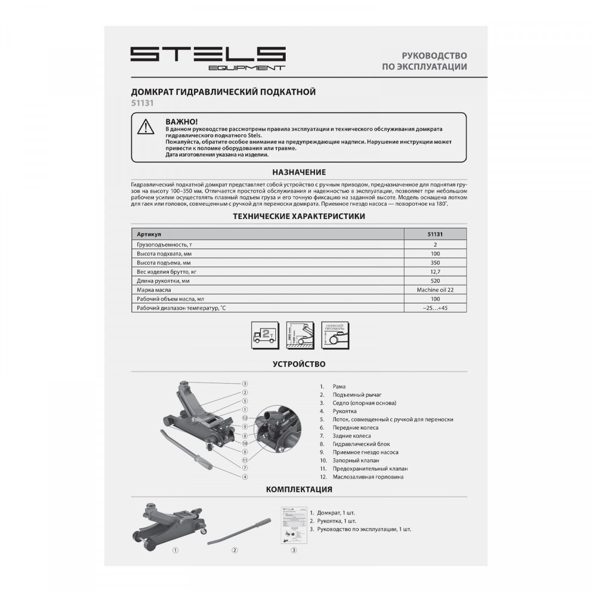 • Защита от перегрузки — предохранительный клапан исключает подъем грузов массой более 2 т.