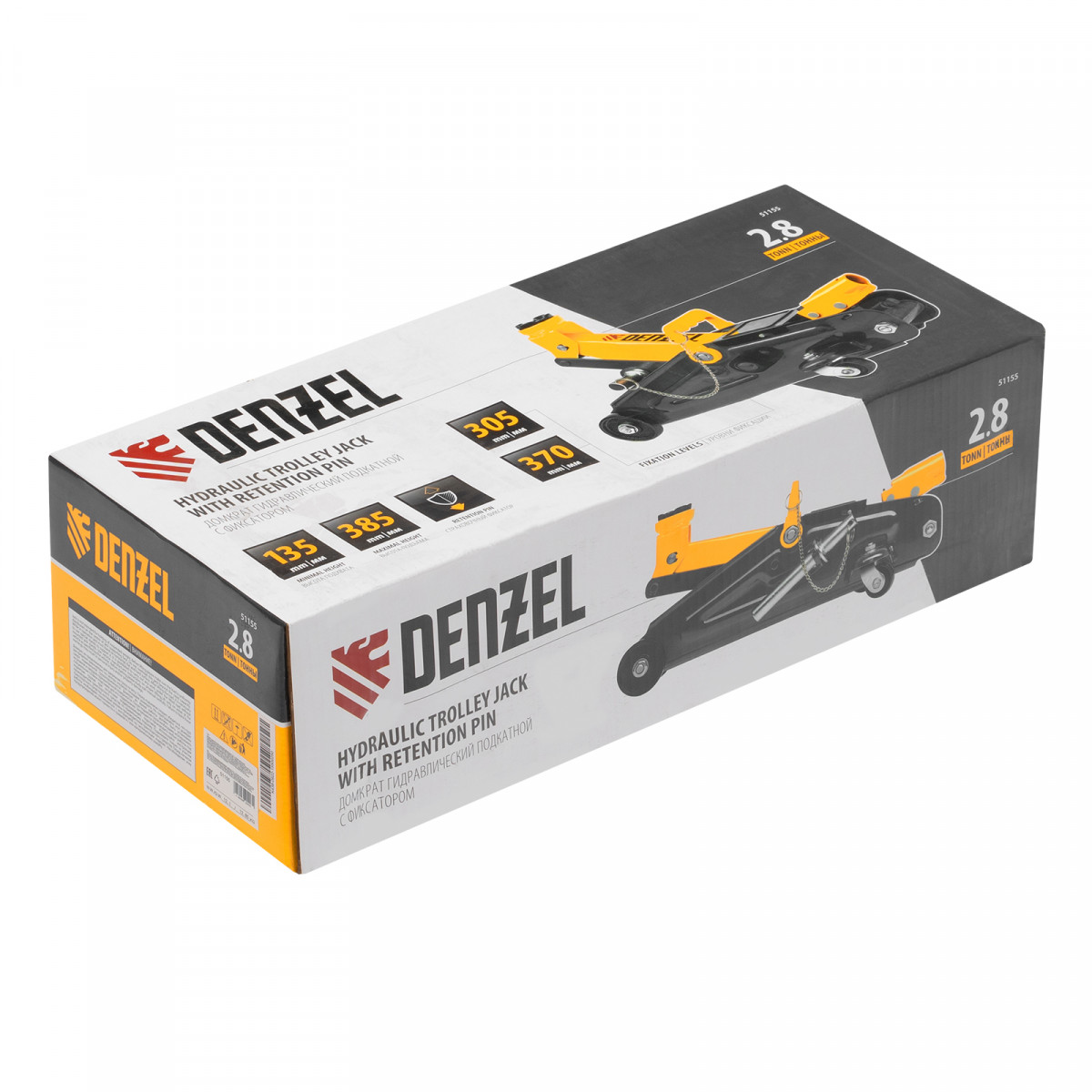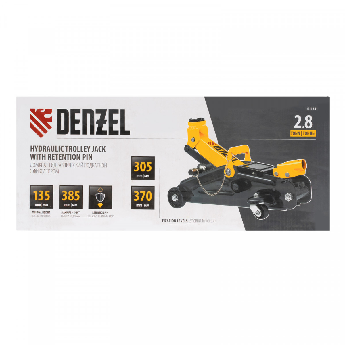 Гидравлический подкатной домкрат с фиксатором Denzel 51155 с высотой подхвата 135 мм предназначен для плавного подъема грузов массой до 2,8 т на высоту до 385 мм. Страховочный штифт позволяет фиксировать подъемный рычаг на высоте 305 и 370 мм для безопасной работы. Домкрат пригодится владельцам легковых автомобилей со стандартным клиренсом.