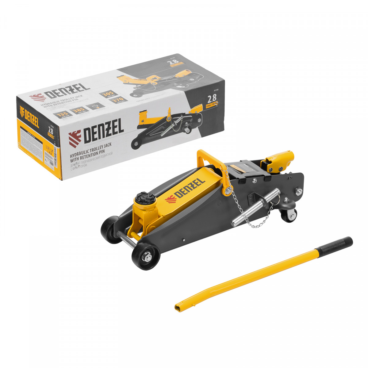 Домкрат гидравлический подкатной с фиксатором, 2,8 т, 135-385 мм Denzel
