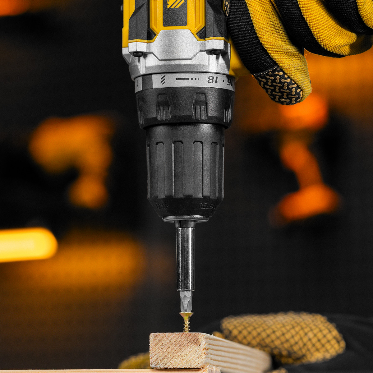 • Настройка крутящего момента — 18+1 ступень регулировки позволяет выбрать оптимальный режим в зависимости от типа крепежа и плотности материала.