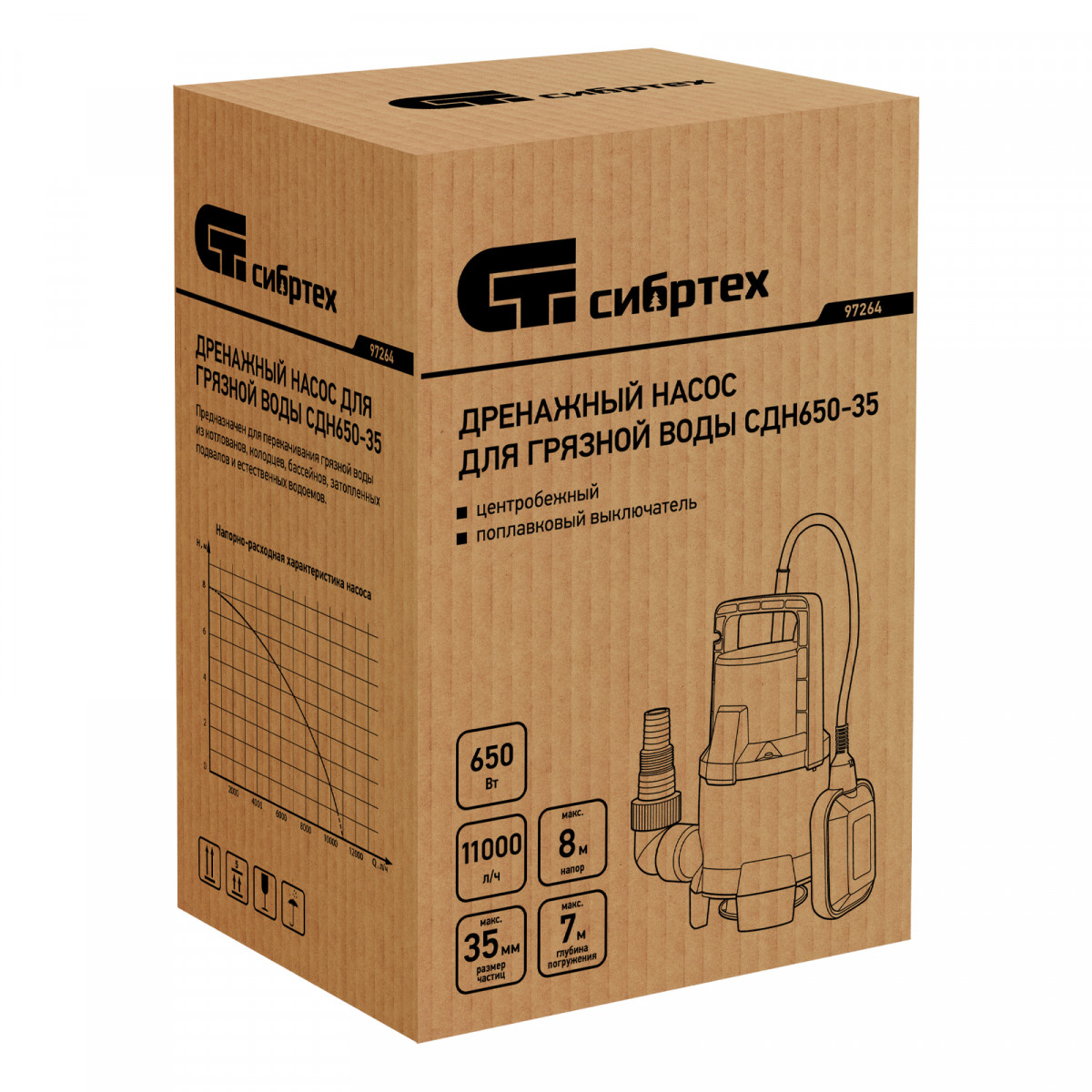 Дренажный насос Сибртех СДН650-35 97264 мощностью 650 Вт и производительностью 11000 л/ч обеспечивает напор до 8 м и предназначен для перекачивания жидких бытовых отходов и сточных вод, содержащей плавающие твердые включения размером до 35 мм. Насос питается от однофазной сети с напряжением 230 В, поэтому подходит для применения в частных домах, дачных коттеджах и на небольших строительных объектах