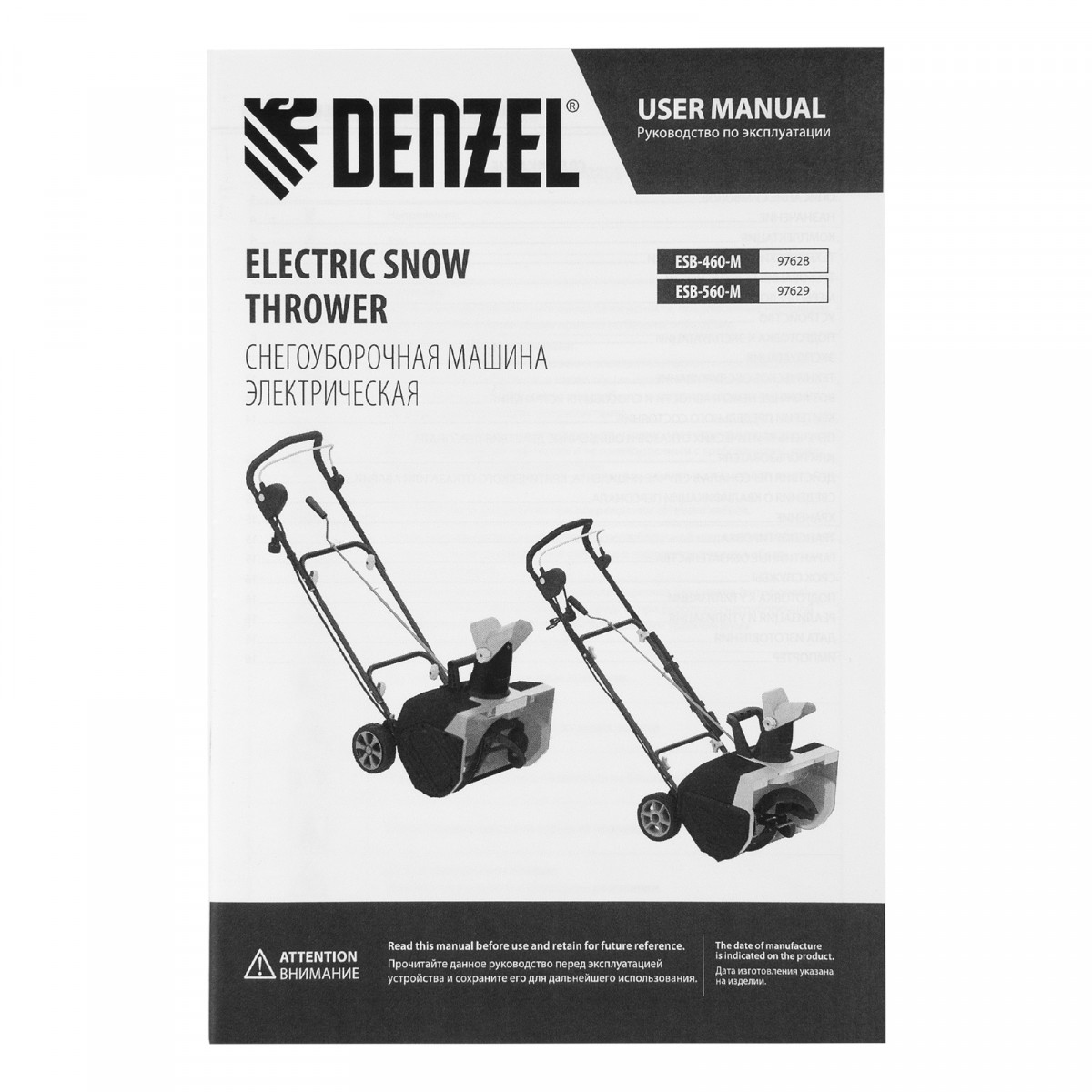 Электрическая снегоуборочная машина ESB-560-M, 2,5 кВт, металлический шнек, LED фара Denzel