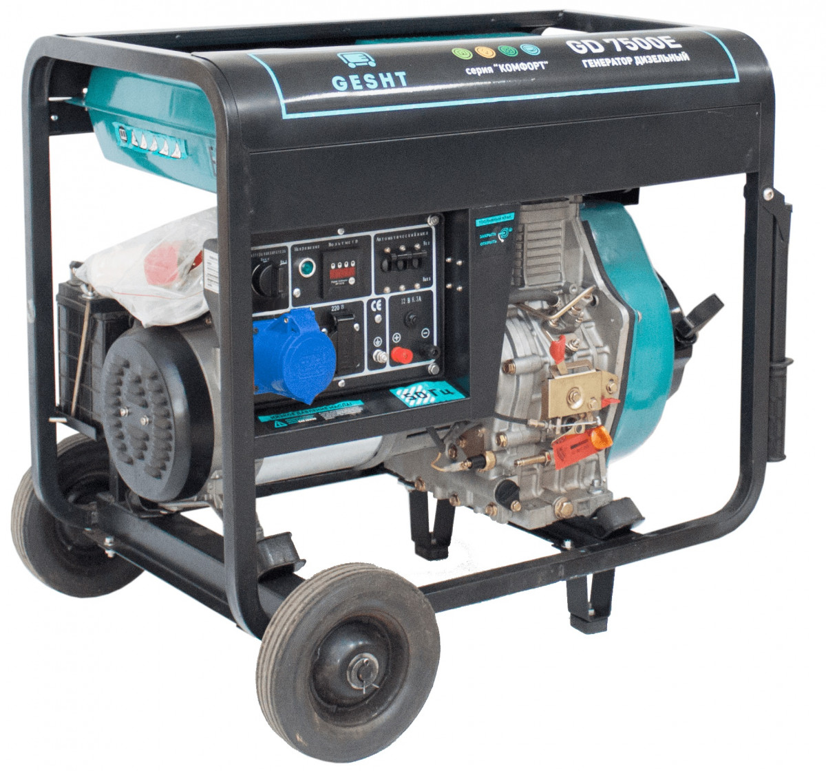 Дизельный генератор Gesht GD7500E поставляется вместе с транспортировочным комплектом, который заметно упрощает перемещение тяжелого оборудования. Диаметр колес достаточен для использования генератора за пределами помещений с ровным полом. Удобное расположение бака исключает его нагрев в процессе работы. Розетки выведены на панель управления. Запуск оборудования проводится только при повернутом ключе - такая система препятствует случайному запуску генератора.