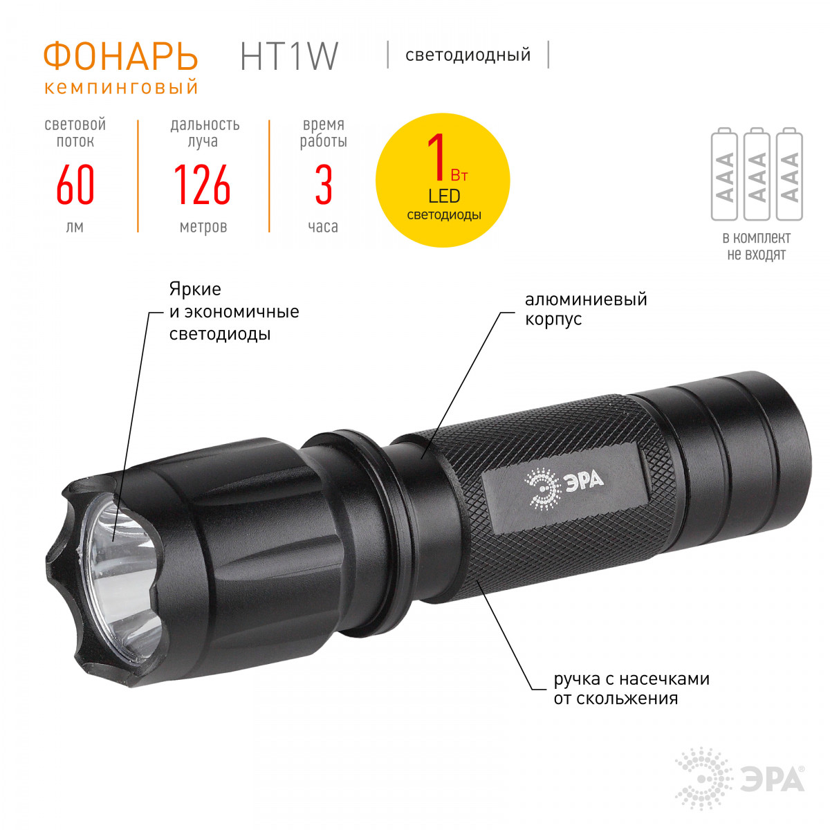 Фонарь ERA HT1W (3xR03) 1 св/д 1W черн./алюм., бл.
