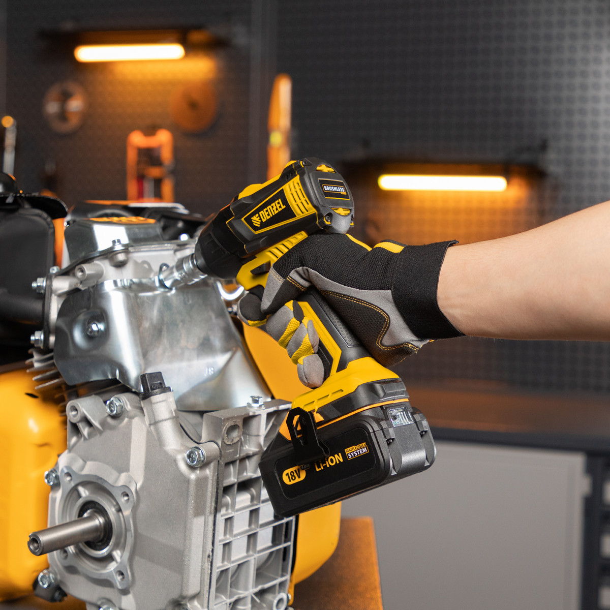 • Полная готовность к работе — в комплект входит зарядное устройство, аккумулятор, адаптер HEX 1/4 дюйма и 4 ударные торцевые головки размером 17, 19, 21 и 22 мм.