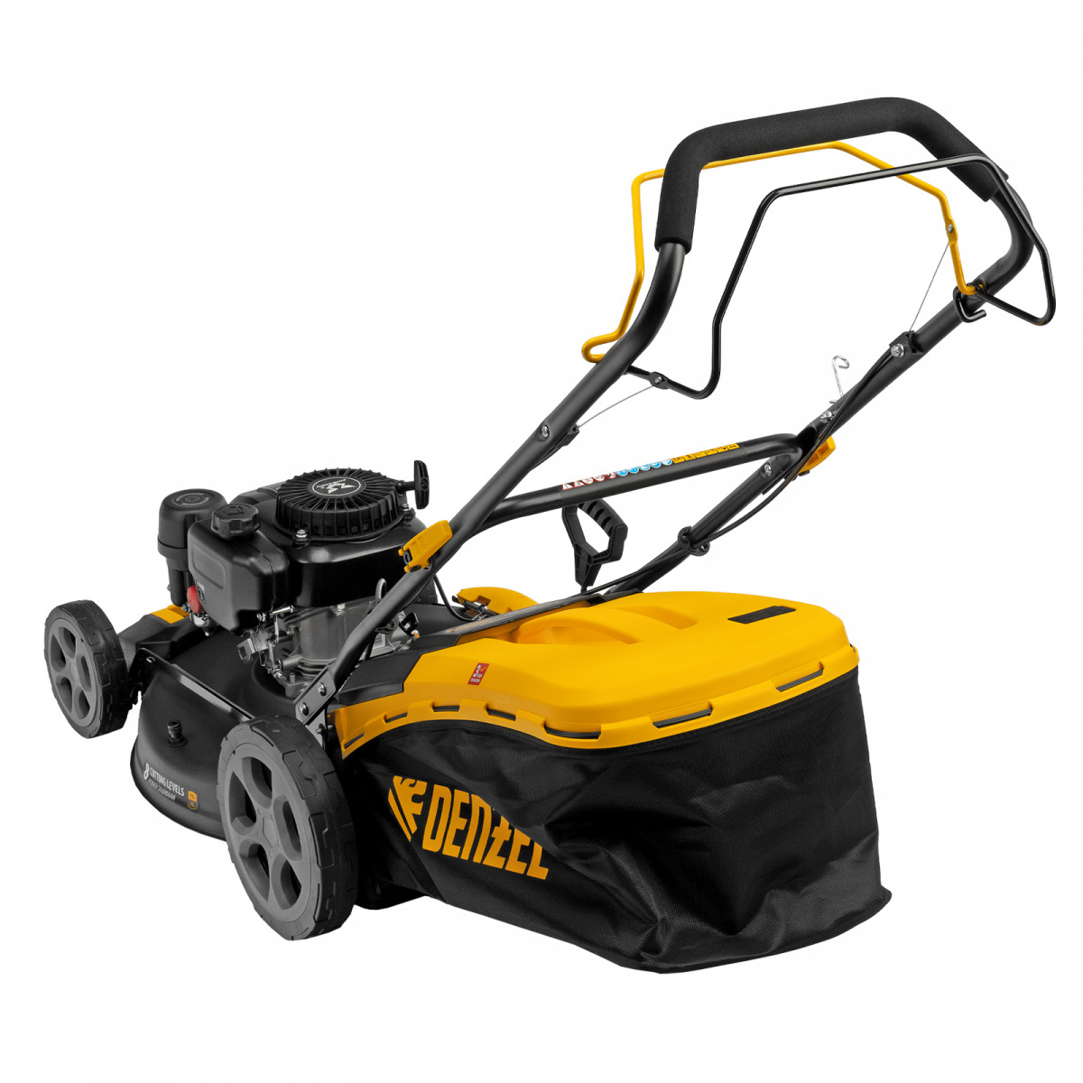 Бензиновая газонокосилка Denzel GLR-510SP-ZS 58825 с приводом на колеса и травосборником вместимостью 65 л, с надежным и экономичным 4-тактным двигателем объемом 171 см3, обеспечивает ширину прохода 51 см. Предназначена для стрижки газонов и скашивания травы в саду, будет полезна для ухода за дачным участком или придомовой территорией большой площади. Высота скашивания легко регулируется одним рычагом в диапазоне 25-70 мм (предусмотрено 8 уровней).