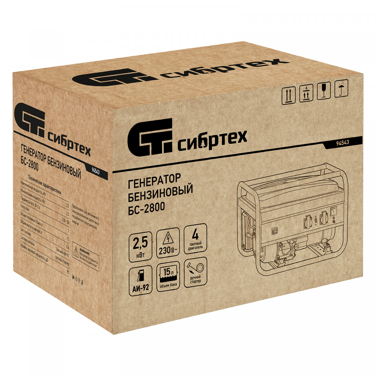 Генератор бензиновый БС-2800, 2.5 кВт, 230В, четырехтактный, 15 л, ручной стартер Сибртех