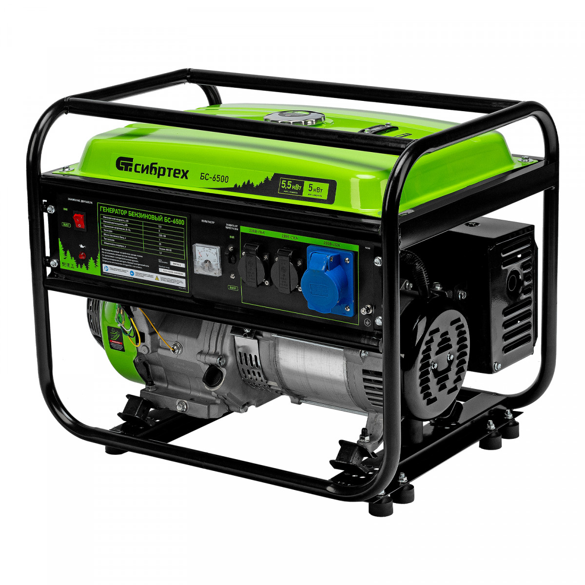 Бензиновый генератор Сибртех БС-6500 94546 на 230 В, с 4-тактным двигателем, баком на 25 л и ручным стартером, выдает 5,5 кВт и подходит для создания целой электросети в загородном доме, магазине, мастерской или на строительной площадке. К нему можно одновременно подключить 5 ламп накаливания, холодильник, телевизор. Для подключения приборов предусмотрено 3 розетки. Одна из них силовая на 32А, что позволяет запитать мощное оборудование, например, электрическую плиту.