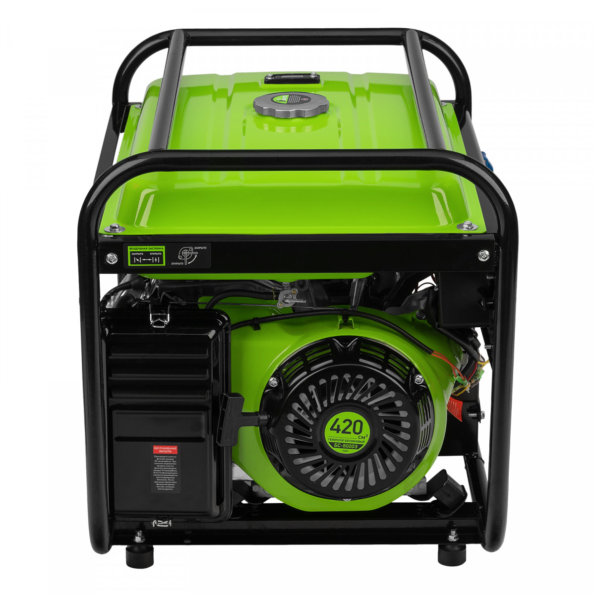Бензиновый генератор Сибртех БС-8000Э 94549 мощностью 6,6 кВт, с 4-тактным двигателем, электростартером и баком объемом 25 л, выдает напряжение 230 В и является самым производительным в линейке. Подойдет для дачи, строительной площадки, мастерской, гаража или магазина. Благодаря мощности 6,6 кВт и наличию силовой розетки способен обеспечить бесперебойную работу нескольких потребителей одновременно, например, электрической плиты, холодильника, 5 ламп накаливания. Электростартер облегчает запуск — для начала работы достаточно просто повернуть ключ.