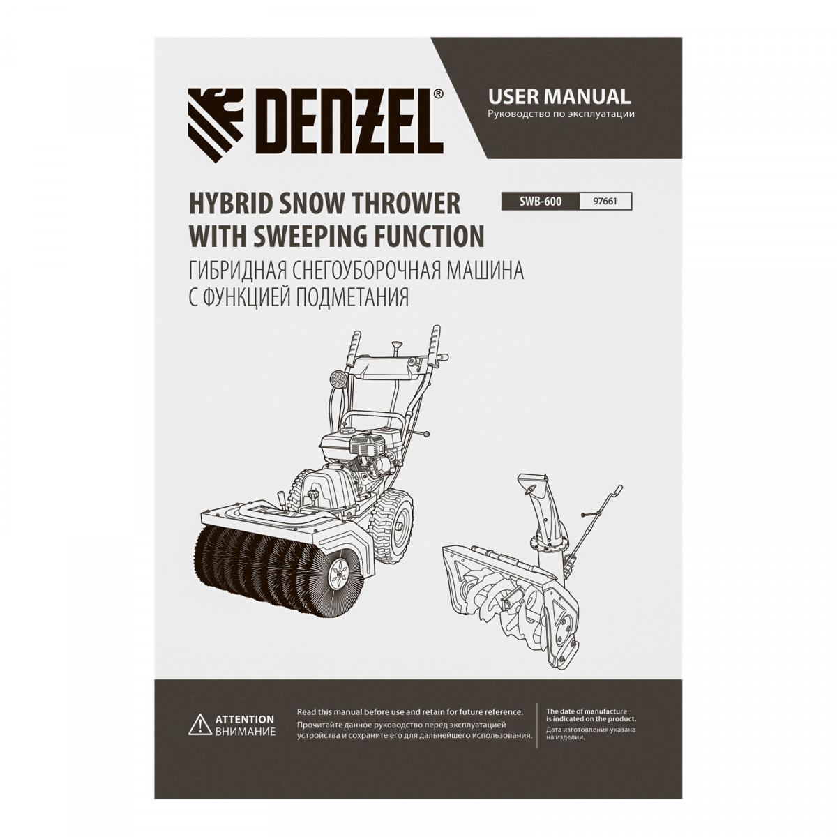Гибридная снегоуборочная машина с функц. подметания SWB-600, 212 сс, руч. старт, 2 насадки Denzel