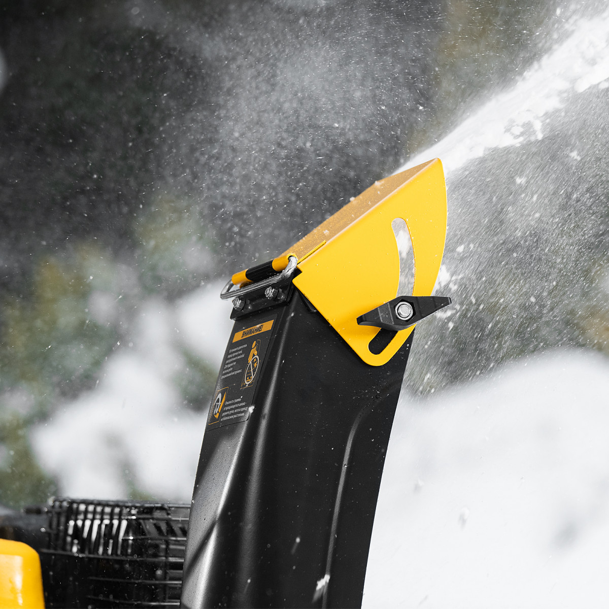 - Выбор направления и дальности выброса снега — разгрузочный желоб поворачивается на 190° с помощью рукоятки.