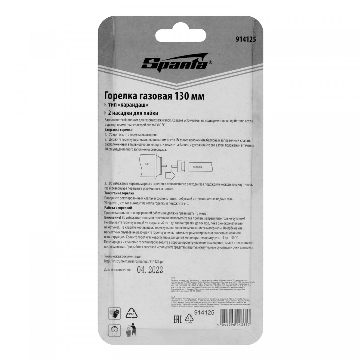Газовая горелка Sparta 914125 типа «Карандаш», длиной 130 мм, с 2 насадками для пайки, предназначена для получения узкого ровного устойчивого пламени. Может использоваться для розжига костра или мангала, нагрева различных материалов, размораживания замков. Пламя горелки не боится ветра, поэтому ее можно использовать на улице. Горелка подойдет для бытовых целей, будет полезна туристу или радиолюбителю.