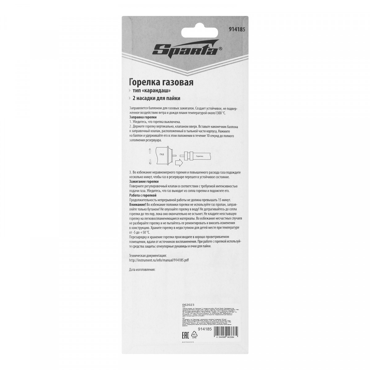Газовая горелка Sparta 914185 типа «Карандаш», длиной 200 мм, с 2 насадками для пайки, предназначена для получения узкого ровного устойчивого пламени. Может использоваться для розжига костра или мангала, нагрева различных материалов, размораживания замков. Пламя горелки не боится ветра, поэтому ее можно использовать на улице. Горелка подойдет для бытовых целей, будет полезна туристу или радиолюбителю.