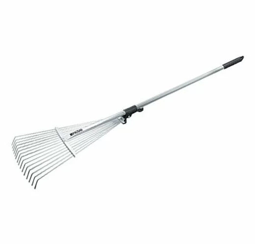 Грабли веерные регулируемые, 15 круглых, сплющенных на концах зубьев, охват рабочей части от 200 до 440 мм. Алюминиевый черенок длиной 1600 мм с резиновой ручкой на конце. Зубья закреплены на подвижной, скользящей по черенку втулке, которая фиксируется эксцентриковым зажимом в любом необходимом положении, изменяя ширину захвата. Предназначены для сбора опавшей листвы, срезанных веток, сорняков, садового мусора. Круглые жесткие зубья позволяют также использовать грабли для аэрации почвы. Зубья выполнены из пружинной стали 65Г и имеют повышенную жесткость, что обеспечивает удобство в работе. Оксидирование зубьев защищает от коррозии.
