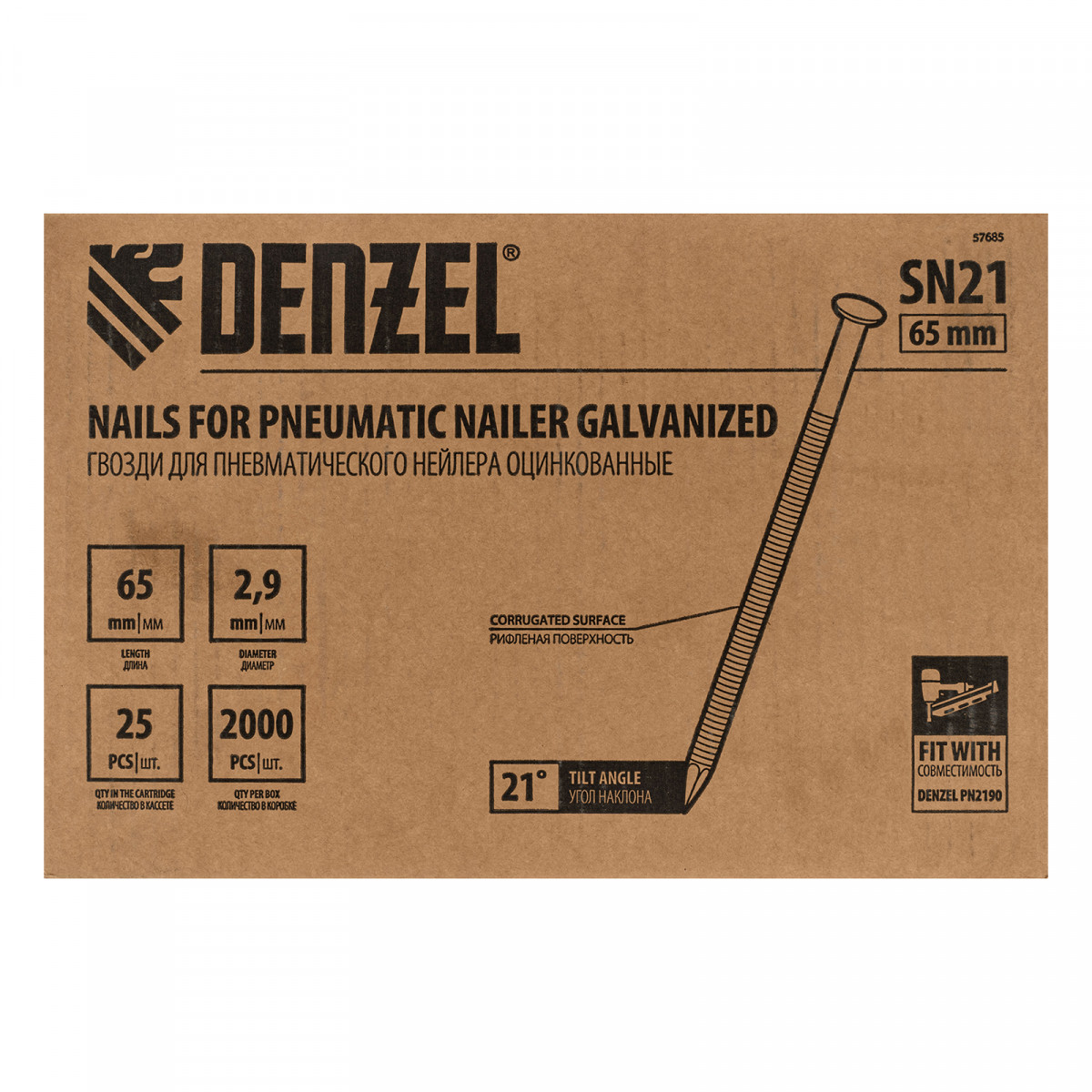 Оцинкованные гвозди Denzel 57685 типа SN21, длиной 65 мм и диаметром 2,9 мм, 2000 шт. в упаковке, — расходники для пневматического нейлера. Используются для скрепления различных материалов, будут полезны во время сборочных и отделочных работ.
