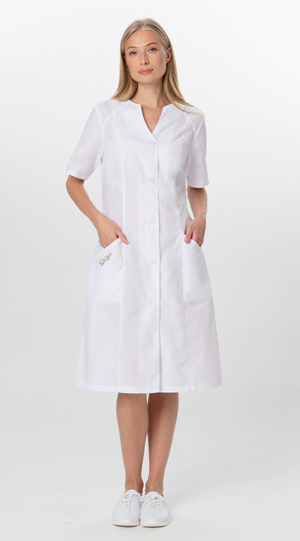 Халат: - полуприлегающий силуэт; - центральная застёжка на петли и пуговицы - на кокетке; - рельефные швы на полочке и спинке; - горловина фигурной формы; - рукав короткий; - накладные карманы с вышивкой в шве деталей полочки; - хлястик на спинке. Цвет: белый Ткань: «Тиси» Состав: 65% п/э, 35% х/б, пл. 120 г/м