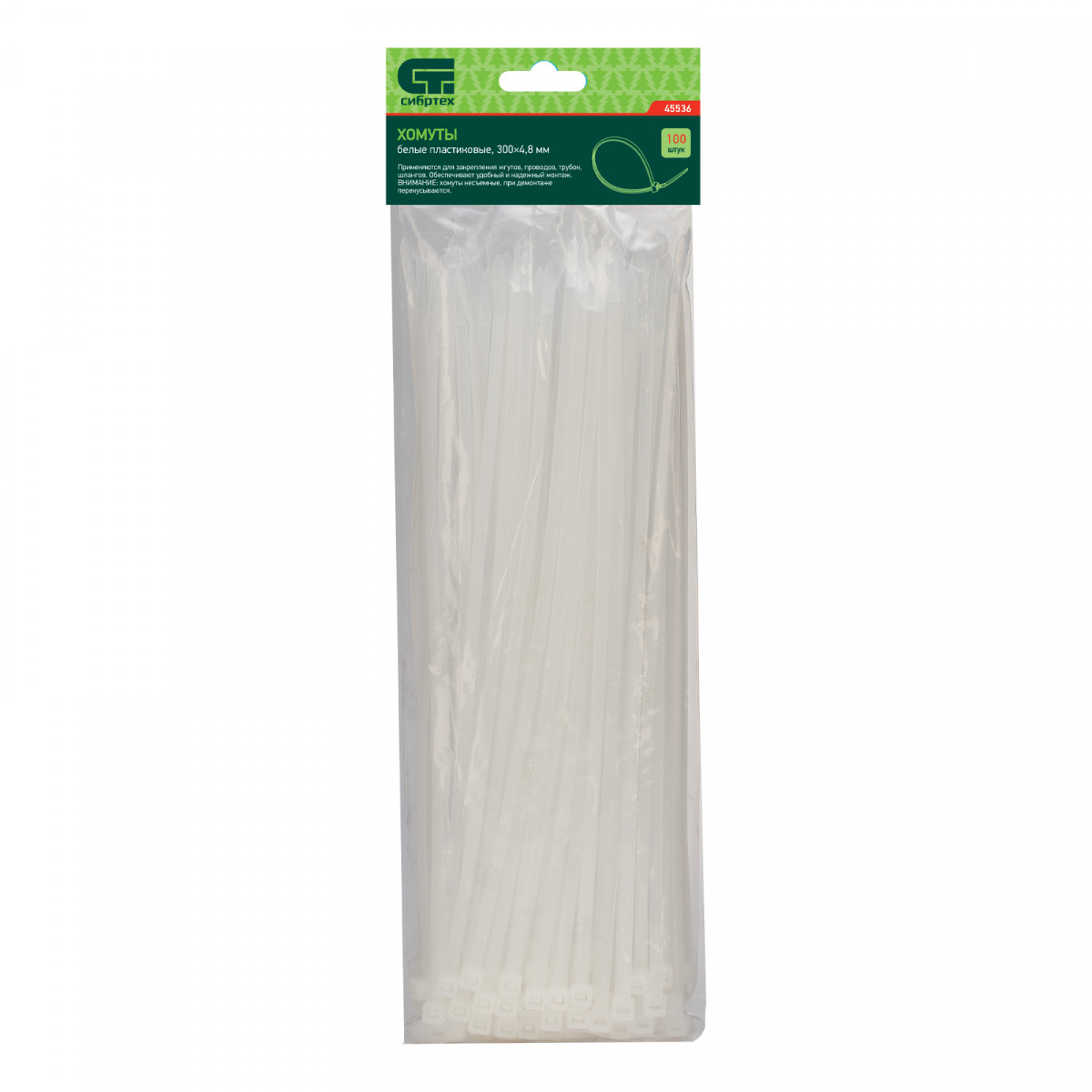 Белые пластиковые хомуты Сибртех 45536, 300 х 3,6 мм, 100 шт. в упаковке, используются для стяжки кабелей, закрепления трубок, шлангов, рекламных конструкций, а также для упаковки различных предметов. Пригодятся во время прокладки электрических и локальных вычислительных сетей, ремонта компьютерной техники, оформлении торговых стендов, комплектовании товара, будут также полезны дома, на даче и в гараже.