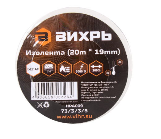 Изоляционная лента «Вихрь» белая (20 м * 19 мм) - изолента профессионального уровня, изготовлена на основе пленки из поливинилхлоридного изоляционного пластиката. Специальные добавки, используемые при производстве данного материала, повышают эластичные свойства ленты, увеличивают ее долговечность и обеспечивают устойчивость к горению. Изолента Вихрь предназначена для проведения всех видов электромонтажных работ: электрической изоляции проводников, сращивания и жгутирования, защиты от механических повреждений, цветовой маркировки.