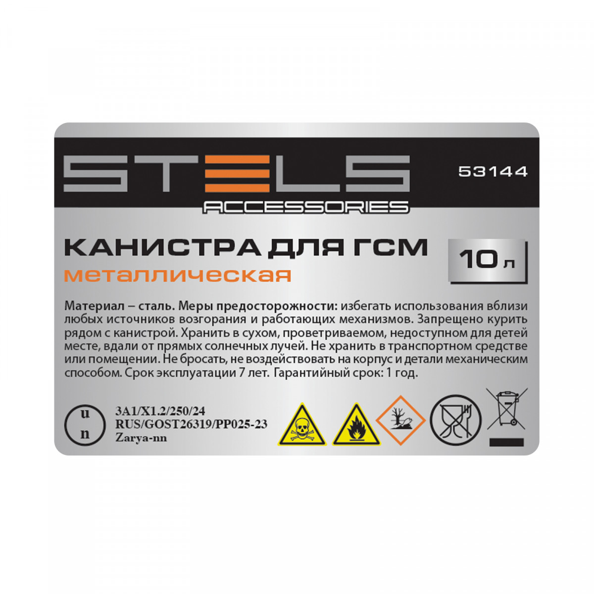 Металлическая канистра STELS 53144 объемом 10 литров предназначена для хранения и транспортировки бензина и других горюче-смазочных материалов (ГСМ). Ее можно разместить в багажнике автомобиля или поставить в гараже. Канистра пригодится для заправки авто и садовой бензотехники, разрешен залив топлива на АЗС.