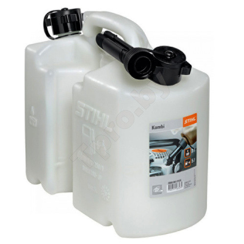 Сдвоенная канистра для 5 литров топлива и 3 литров цепного адгезионного масла.