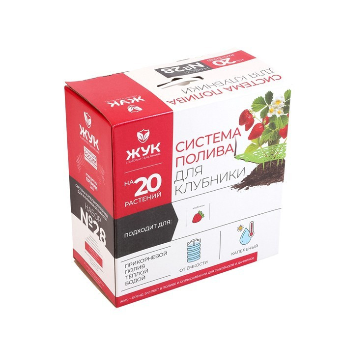 С помощью магистрального и подающего шлангов вода подводится к каждому растению, стрелка-капельница вставляется в подставку и капает под корень куста. Пластиковая подставка не дает листьям распадаться и защищает ягоды от контакта с землей.