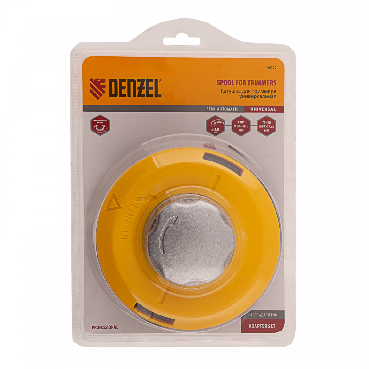 Катушка триммерная полуавтоматическая, легкая заправка лески, гайка M10x1.25, винт M10-M10, алюминиевая кнопка Denzel
